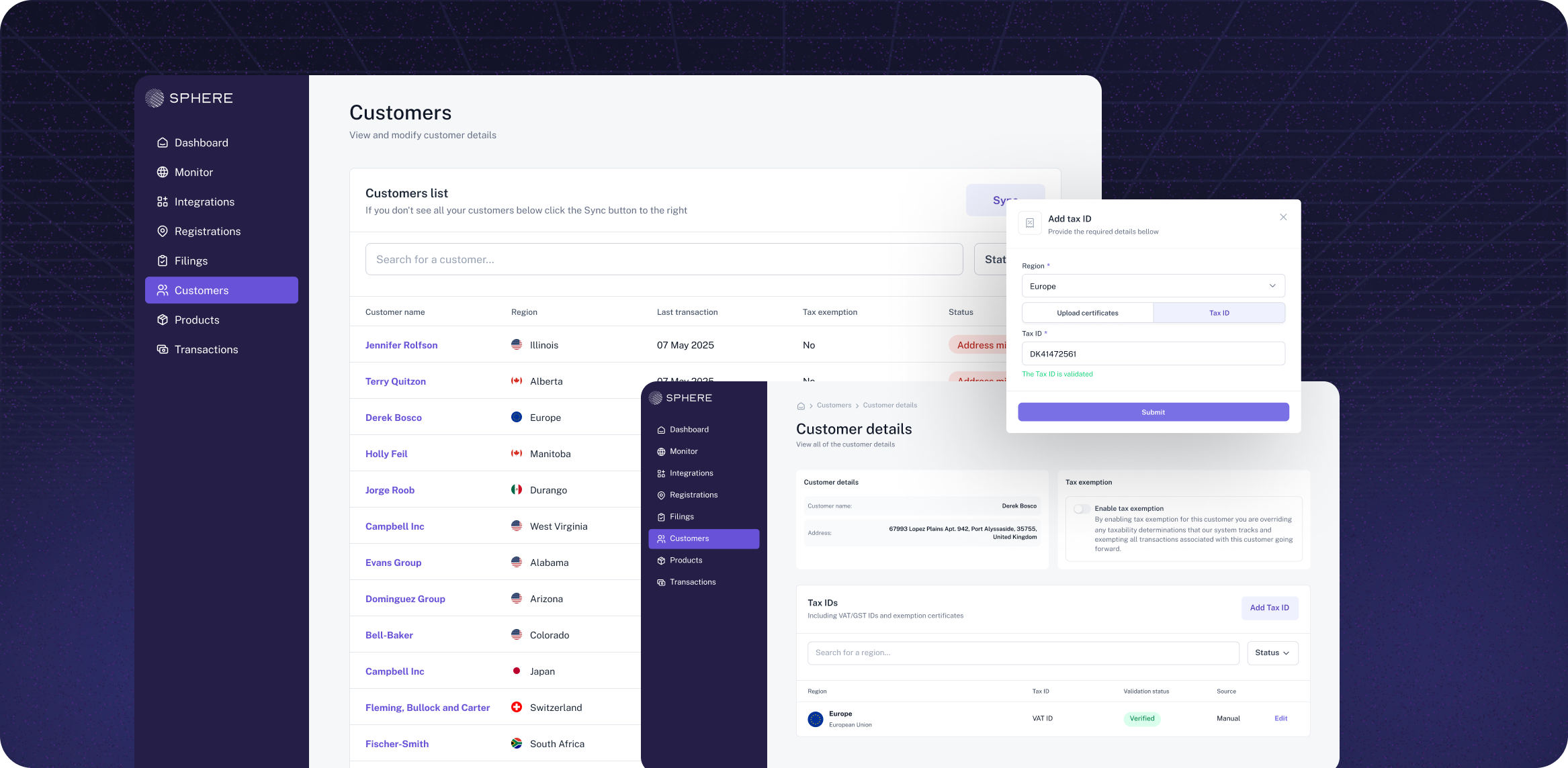 Sphere makes exemption certificate management global, automated and refreshingly simple. Because it's built in, you don’t have to worry about paying more for certificate management as your company grows. And your tax team, even if that’s just one person, doesn’t have to spend valuable time on the administrative hassle of tracking down and manually varying exemption certificates from all over the world.