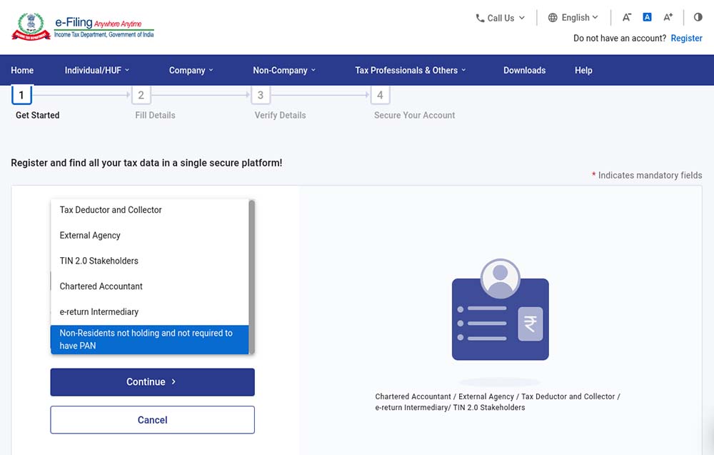 - Step 1: Register on India’s eFiling portal as a “non-resident”