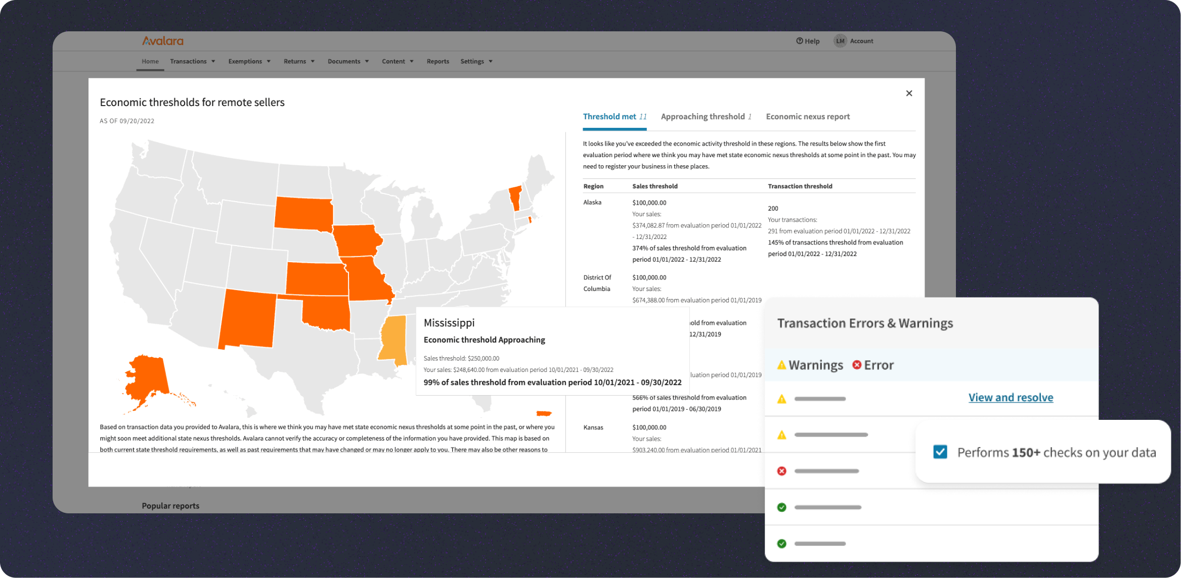 Collecting, filing and remitting sales tax is just one piece of the puzzle. Businesses are also on the hook for use tax obligations, managing exemption certificates, and sometimes voluntary disclosure agreements (VDAs) for addressing past non-compliance. The best platforms also support economic nexus monitoring, alerting you before you cross thresholds in new states. They should track both sales amounts and transaction counts, since states use different triggers. Some require action at $100,000 in sales, others at 200 transactions, and many use both thresholds.