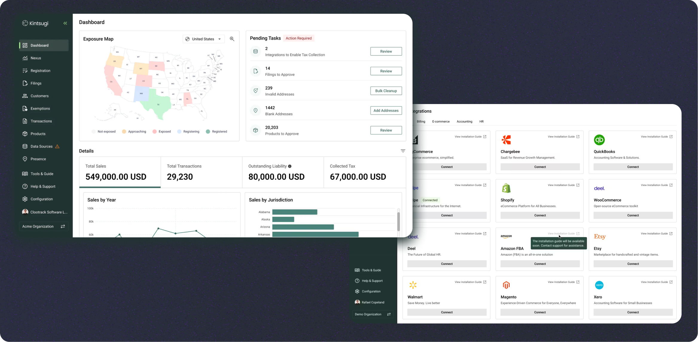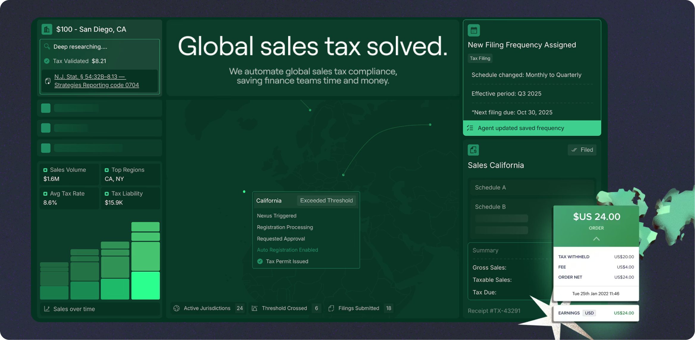 The platform handles end-to-end compliance automatically. It monitors nexus thresholds, calculates taxes in real-time, files returns directly with states, and remits payments electronically. No manual intervention needed.
