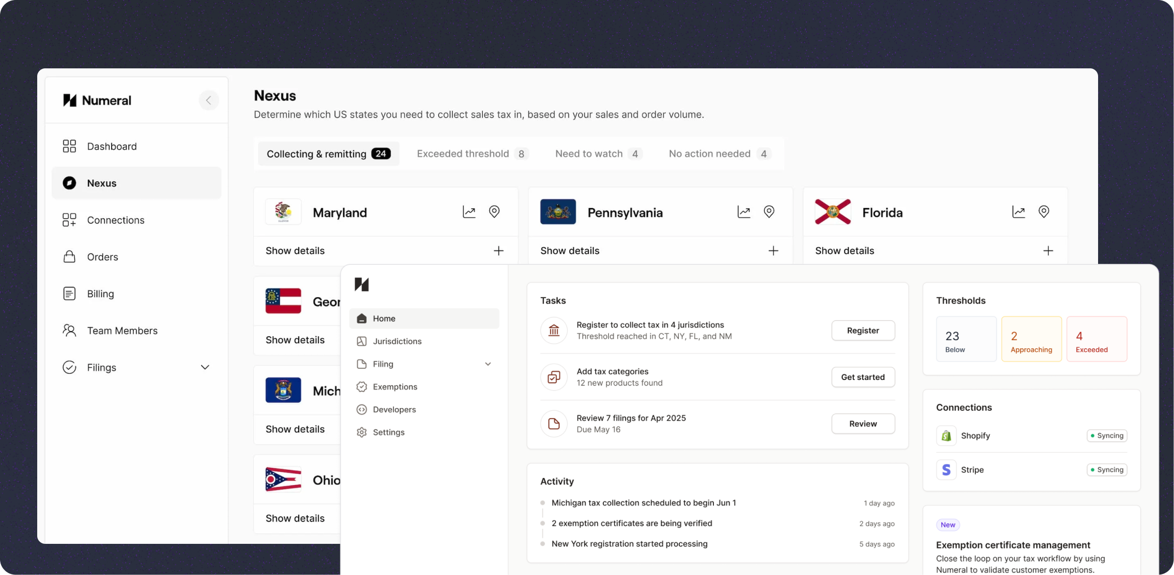 Numeral covers the core bases of US sales tax compliance. Here's what you get: