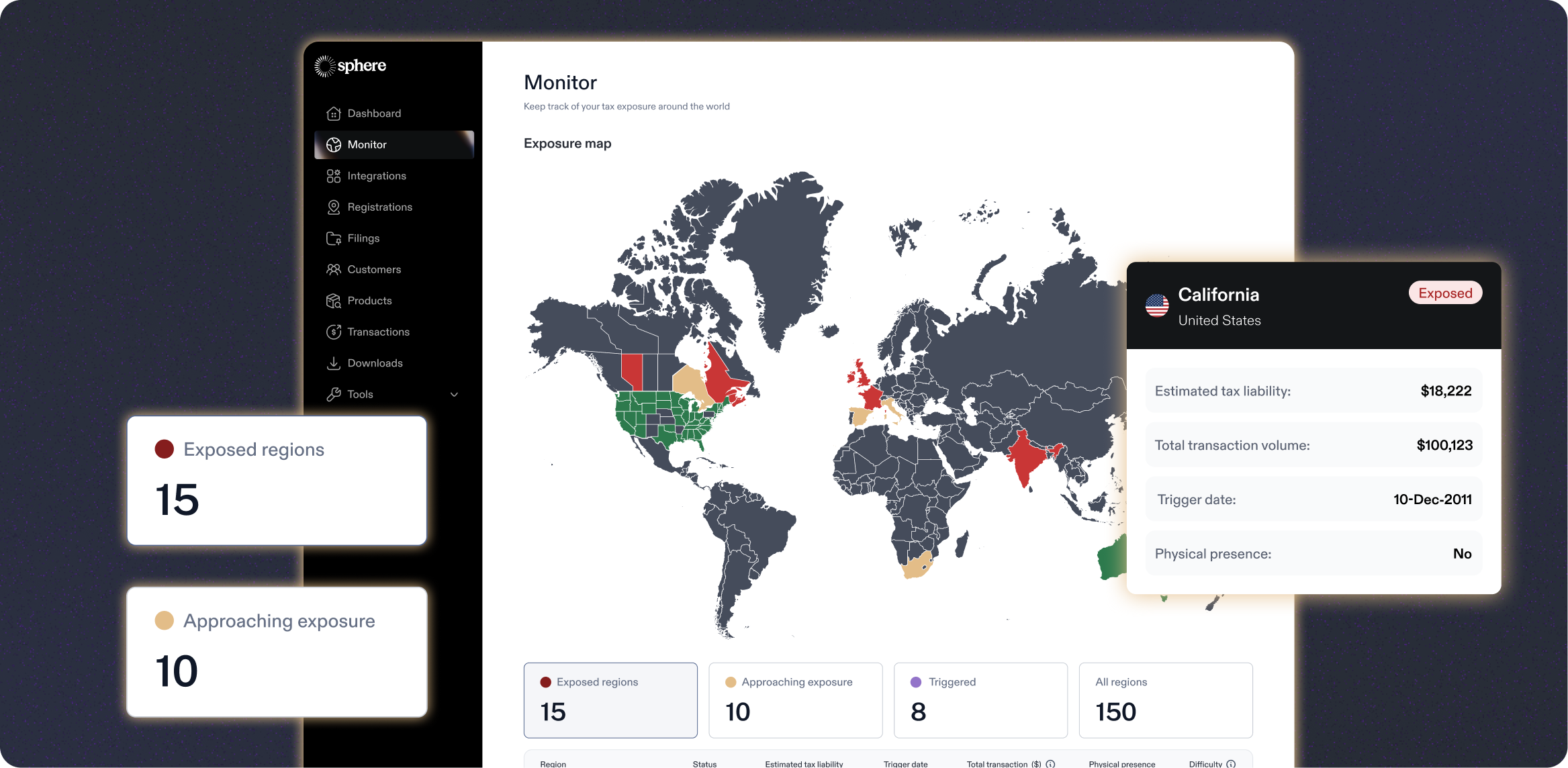 This makes Sphere's long-term cost easy to model. If you're active in 10 jurisdictions, you pay $1,000 per month. No hidden fees.