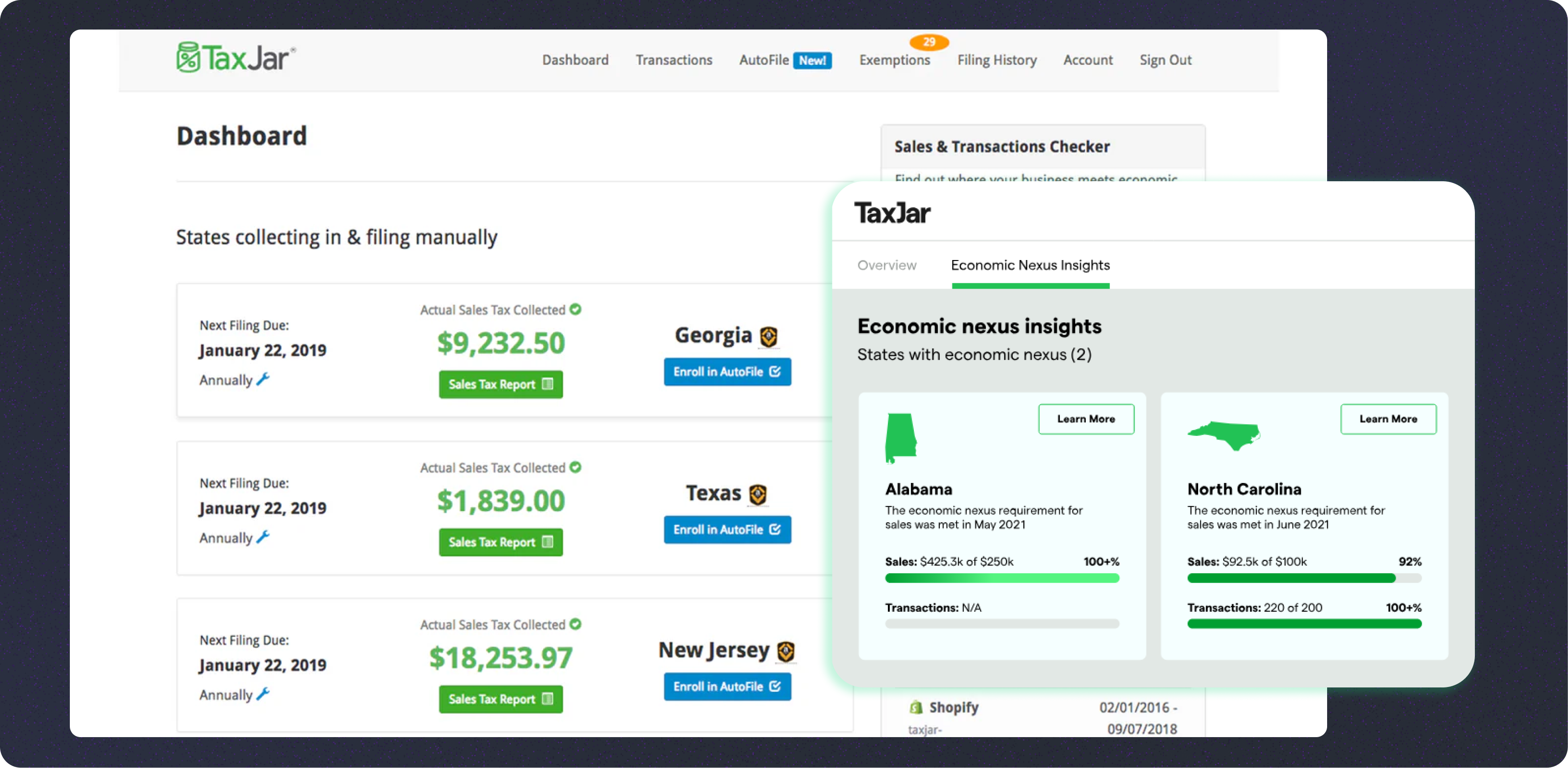 Having an economic nexus means that your business is required to collect sales tax in a state even if you have no office, warehouse, or employees there. All it takes is crossing that state’s revenue or transaction threshold.