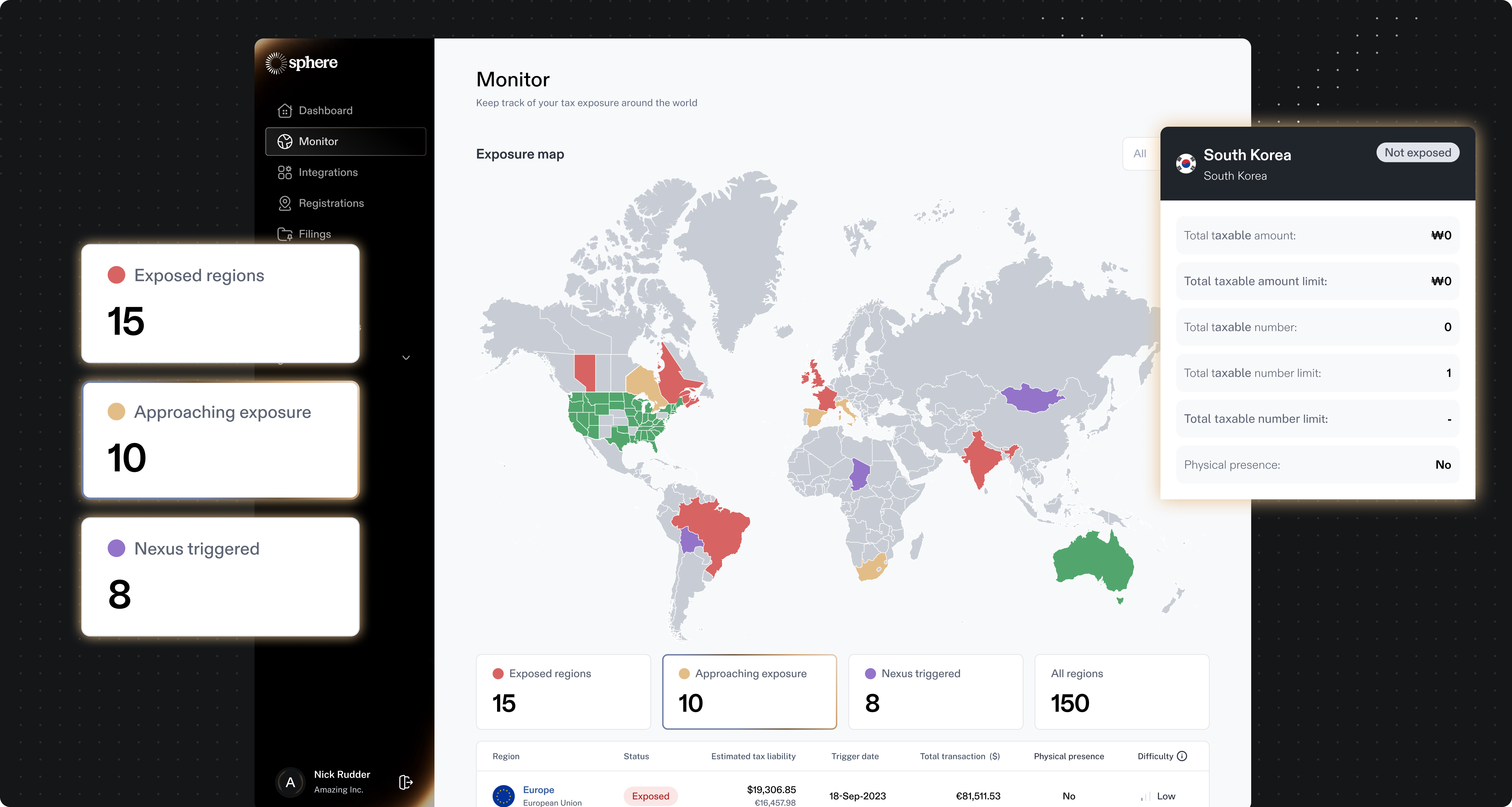 Managing South Korean VAT alongside other global tax obligations can quickly become overwhelming, which is why platforms like Sphere handle the entire compliance workflow - from monitoring sales thresholds and triggering registrations to calculating taxes, generating compliant invoices, and filing returns.