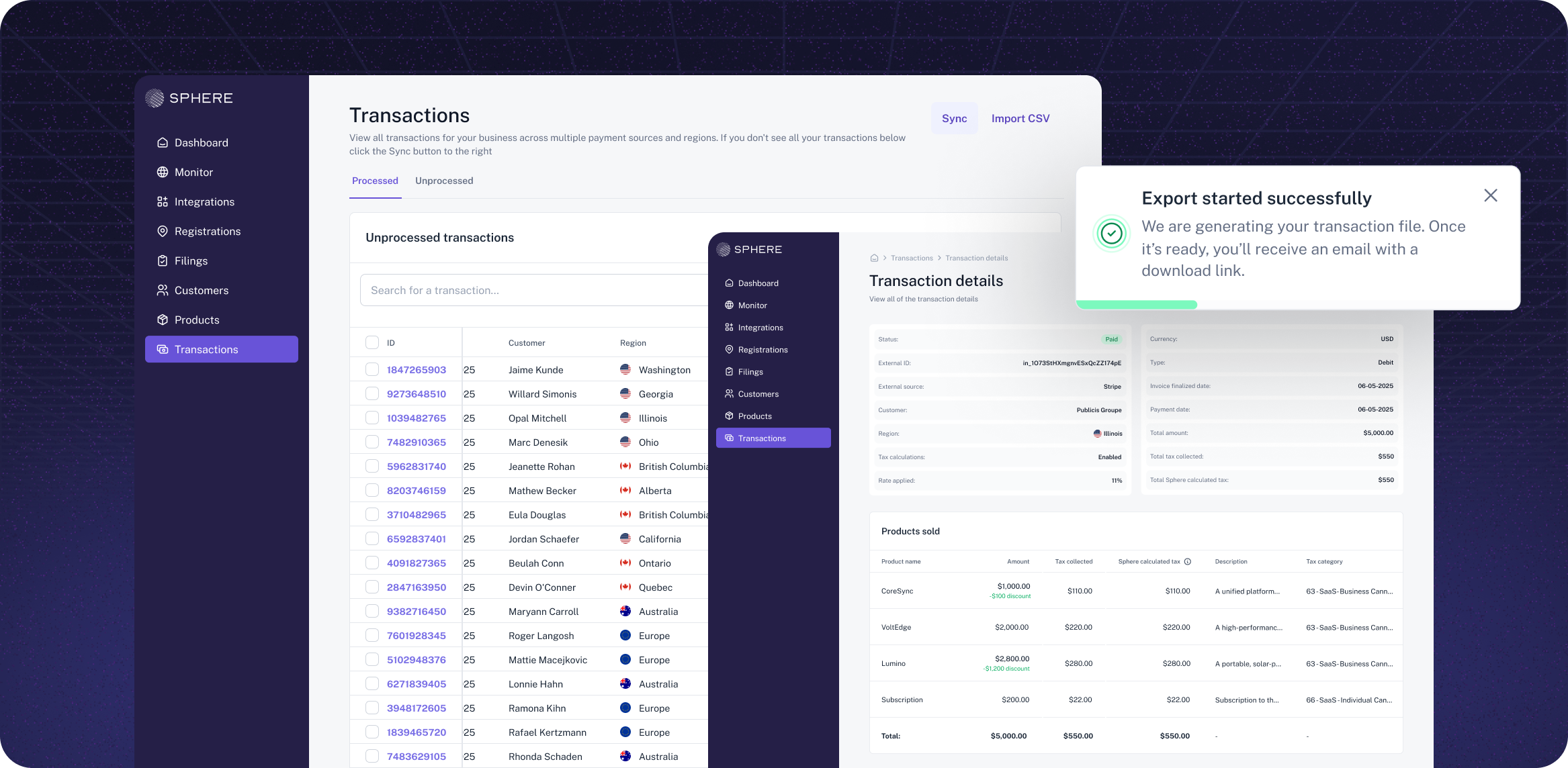 Sphere is different. It's the only platform built from day one to handle both US sales tax and international VAT/GST in a single native solution. The AI-powered platform continuously monitors global tax regulations so you don't have to. Setup takes minutes, pricing is transparent and predictable, and you get actual human support when you need it.