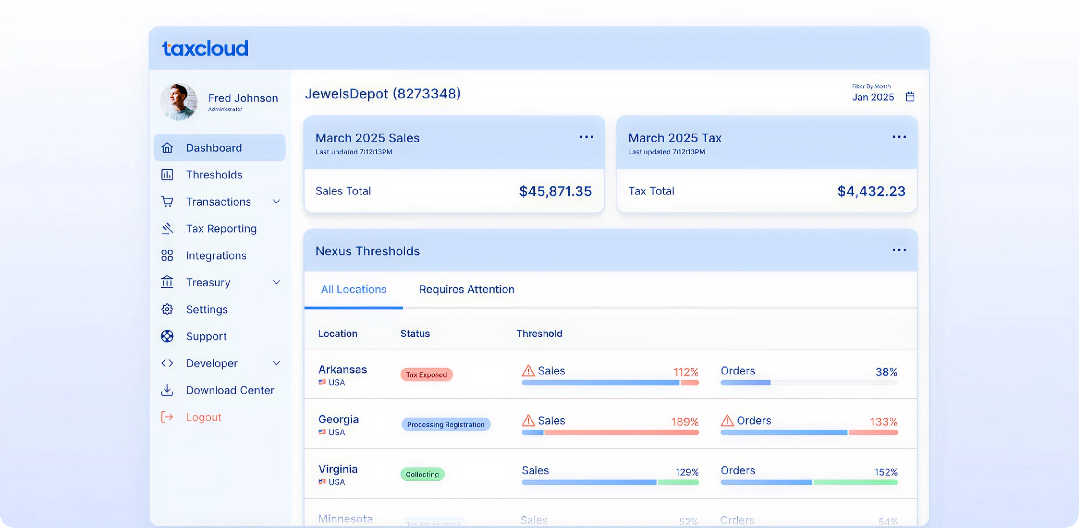 Key strengths: Zamp combines modern automation with strong customer support, transparent pricing with no hidden fees or confusing tiers. Setup is straightforward, and the team is responsive when you need help. Zamp also offers economic nexus monitoring to alert you when you're approaching thresholds in new states.