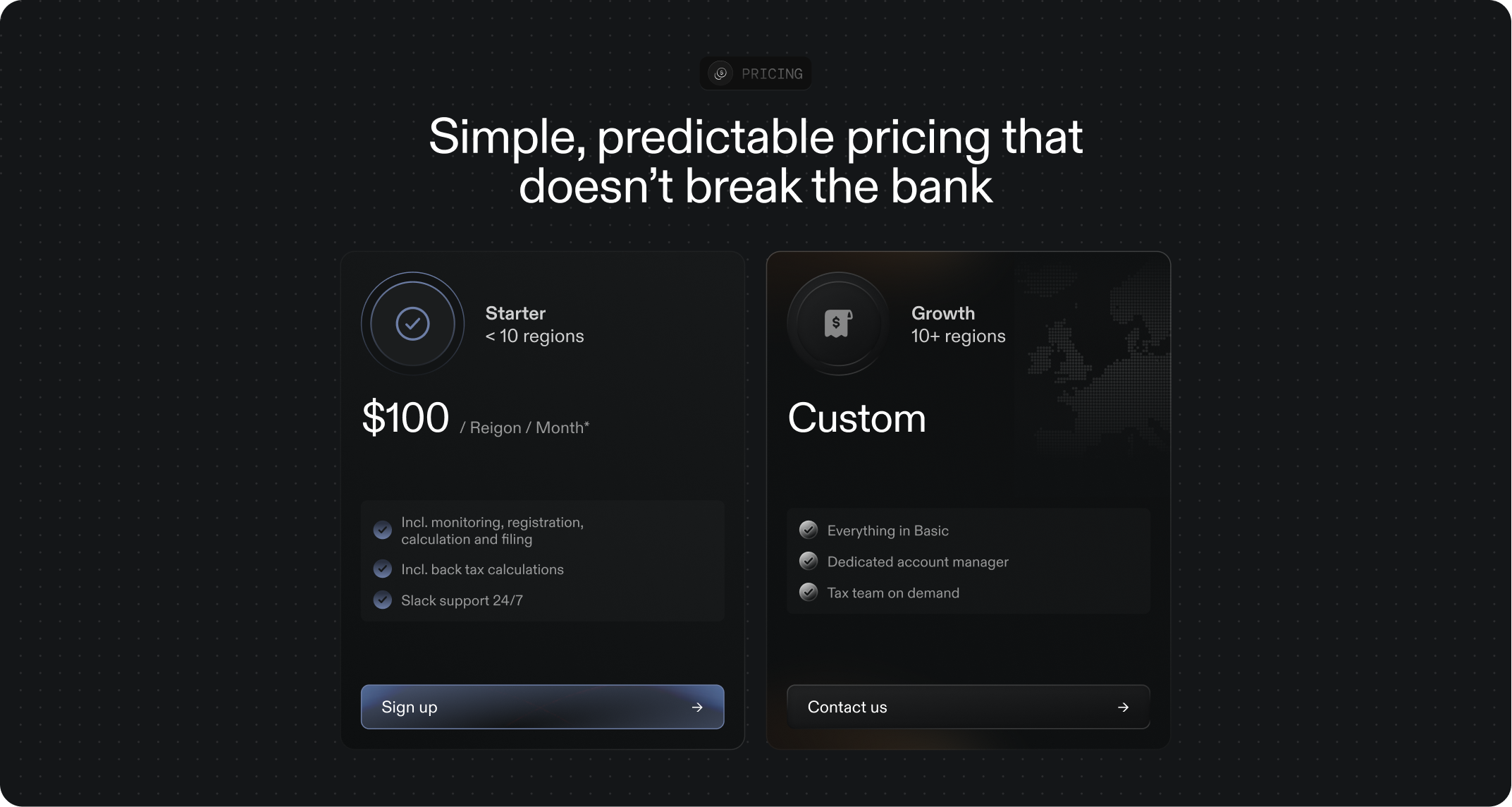 Sphere offers a transparent alternative. One flat rate per region. One platform for calculation, registration, filing, and remittance. And no surprises when your revenue grows.