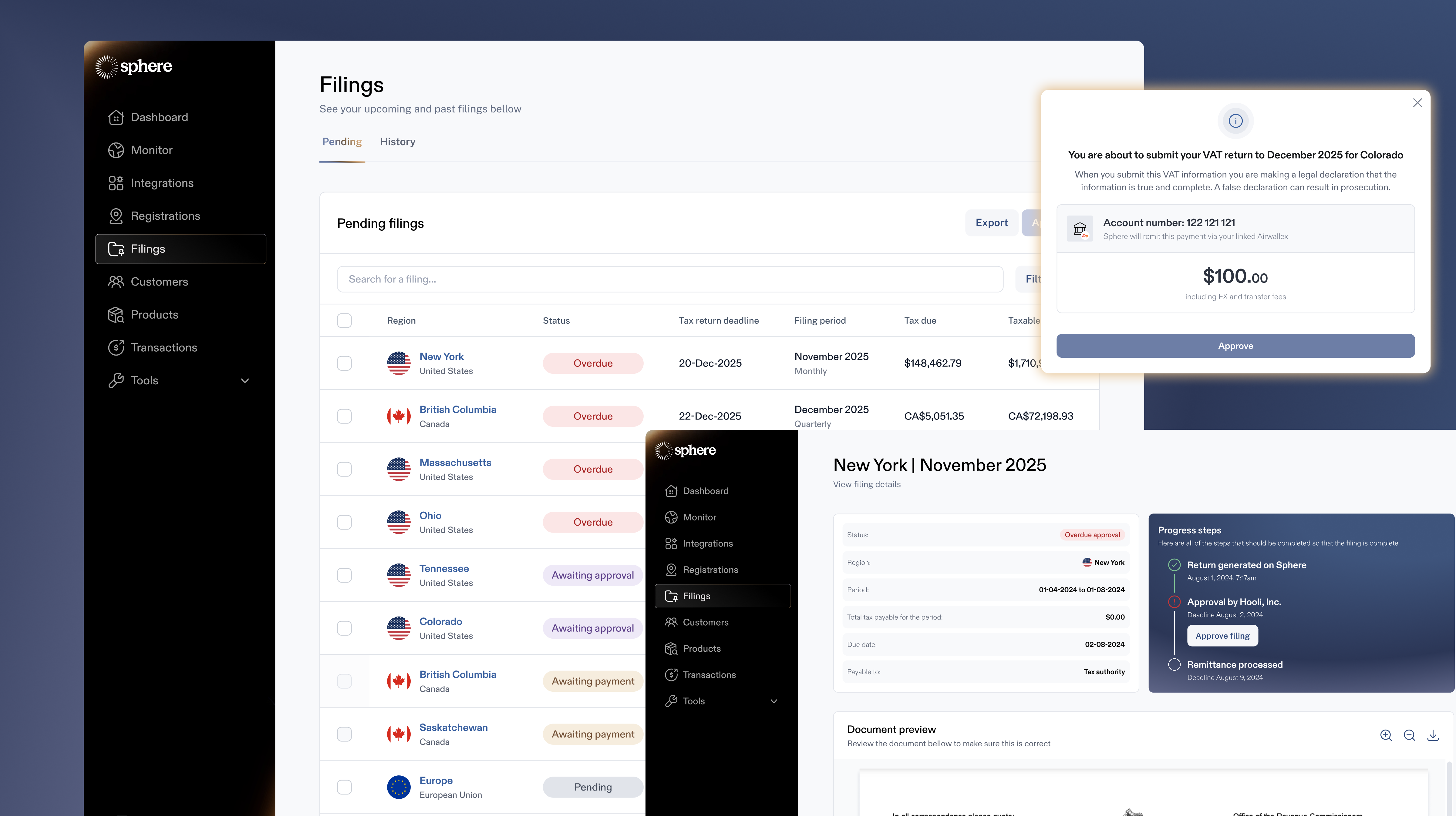 Sphere continuously monitors your sales activity across every US state and international jurisdiction. When your business approaches an economic nexus threshold, Sphere alerts you. Sphere then manages the registration process with the relevant tax authority so you don't miss your compliance window.